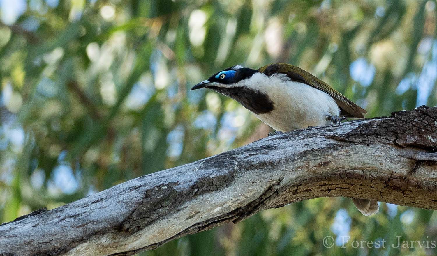 After about an hour or so at Sandy Camp, things seemed to be quieting down, and we had a whale-watching boat to catch. On the way out, however, we were delayed by great views of a Spangled Drongo, then a flock of Blue-faced Honeyeaters and Noisy Friarbirds, two different kinds of large and strange honeyeaters, foraging in the trees above our car. We also had another look at the Royal Spoonbill, now hiding itself in a flock of bin chickens.