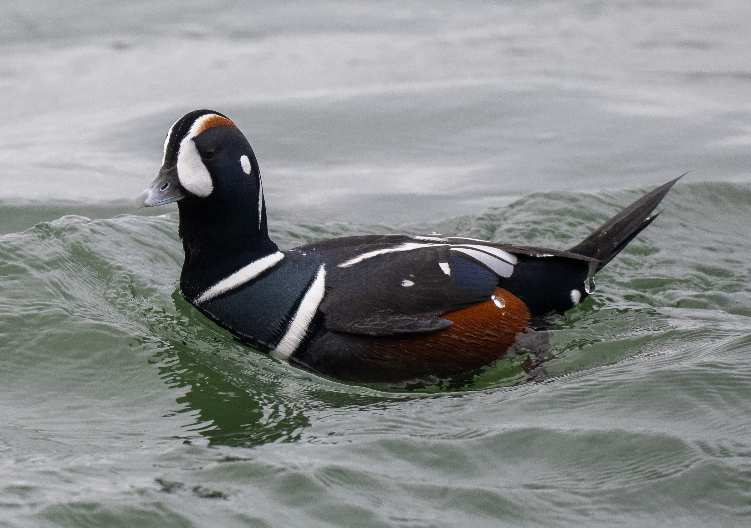 We soon caught up to my first-favorite duck: the small groups of Harlequin Ducks that take up residence at the jetty in the wintertime. The spectacular indigo, orange and white males are quite possibly one of the most eye-catching birds anywhere in the world, and they simply don't make ducks any better than these ones. We were lucky enough to have a couple of them float by at close quarters, though I didn't manage the great flight shots I was hoping for. The slate-grey sky was also a bit disappointing, as I didn't have the gorgeous light I'd had on my previous visit.